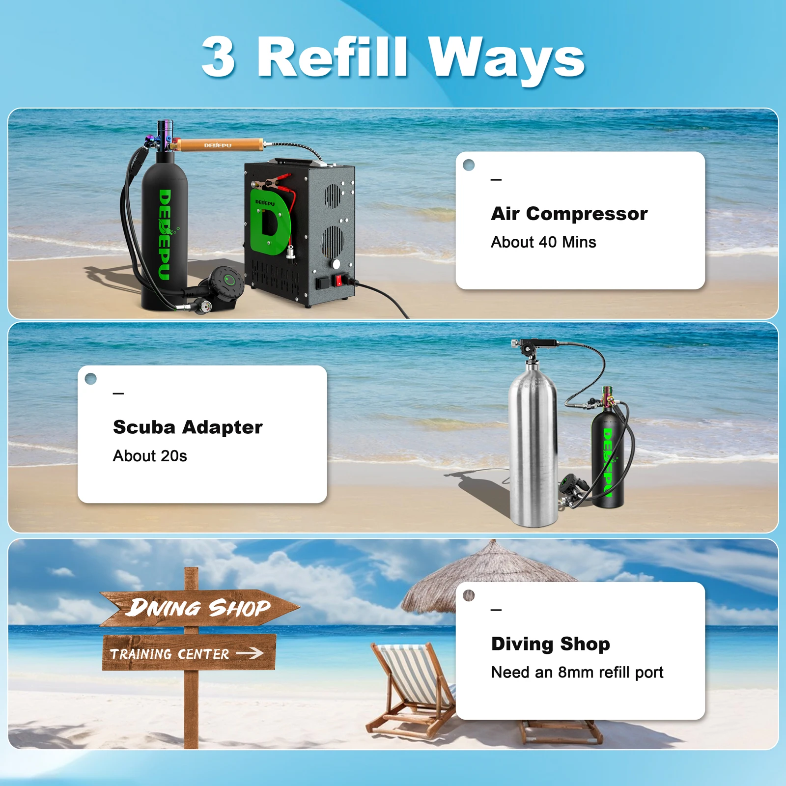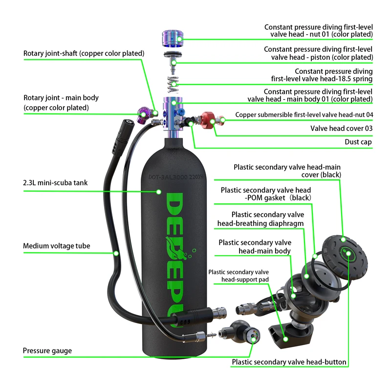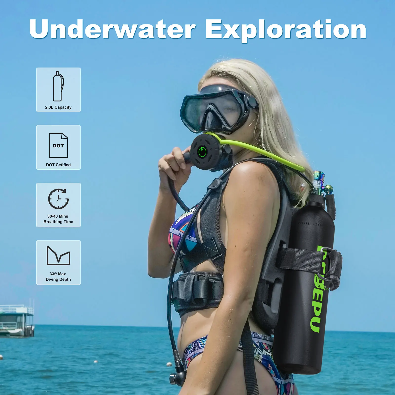 Dive with confidence using this 2.3L scuba diving oxygen tank, designed for safe and reliable underwater breathing. Equipped with a high-pressure system and a comfortable backpack harness, it allows easy transport and secure fit for recreational scuba diving, snorkeling, and other underwater activities. Lightweight yet durable, this tank provides a compact solution for short dives or training sessions, ensuring convenience, safety, and freedom of movement while exploring the underwater world.