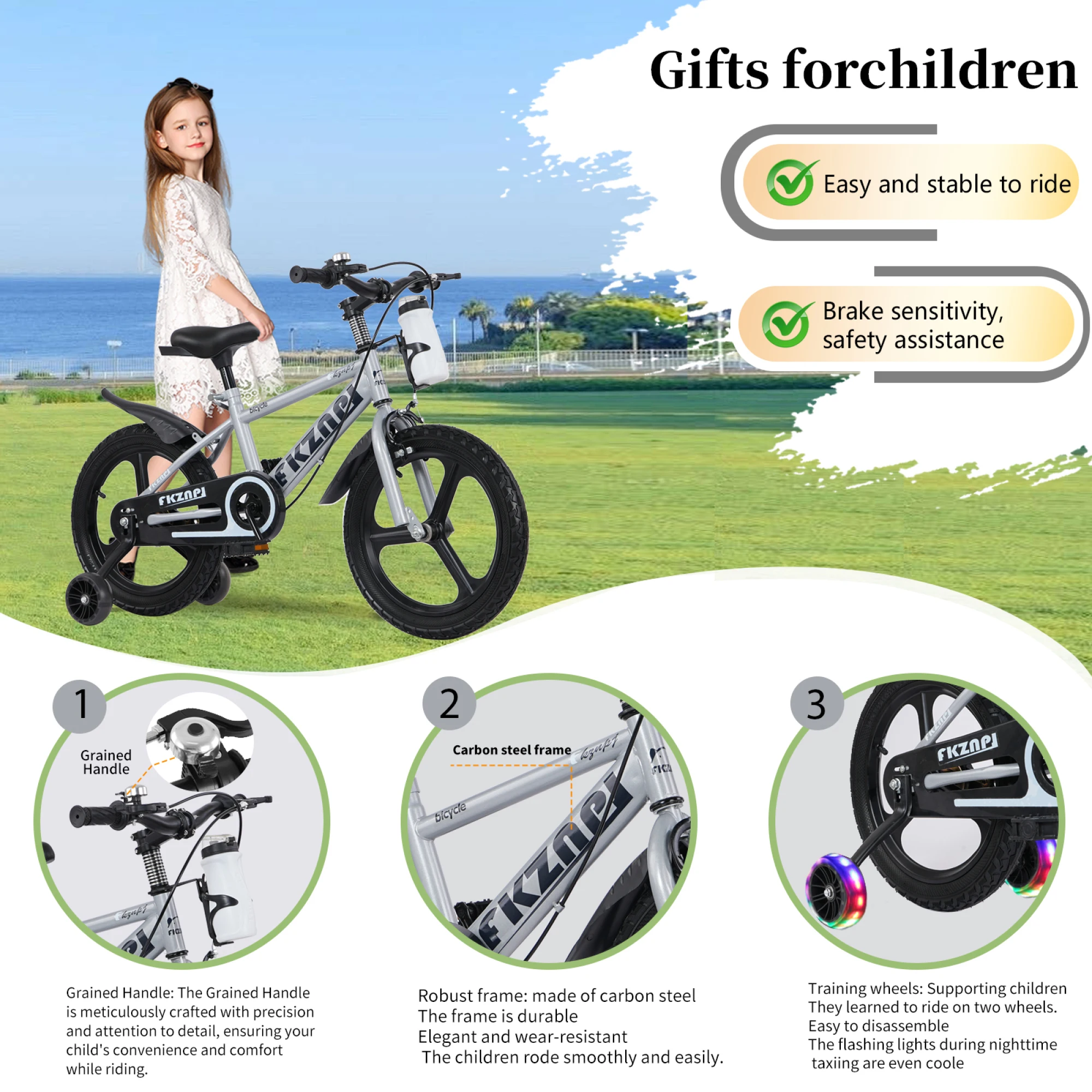 This kids’ bicycle is built for safety, durability, and fun, making it a great choice for young riders aged 3 to 9 years. Featuring a high carbon steel frame, it offers strong and reliable construction for everyday use. The magnesium alloy glow wheels add a playful visual effect while improving visibility during rides. An adjustable seat ensures a comfortable fit as children grow, and the included water bottle adds convenience for longer rides. Designed for beginners, this bike helps children develop balance and confidence while enjoying outdoor cycling.