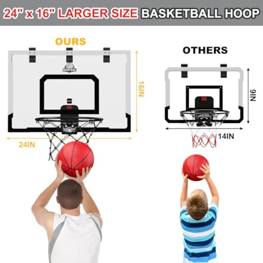 Bring the excitement of basketball indoors with this large over-the-door basketball hoop, perfect for adults and office play. Measuring 24″ x 16″, it features a sturdy backboard for durability and an electronic scoreboard to keep track of every point. Easy to install and designed for indoor fun, this hoop turns any room, office, or dorm into a mini basketball arena. Its compact design ensures endless entertainment without taking up floor space.