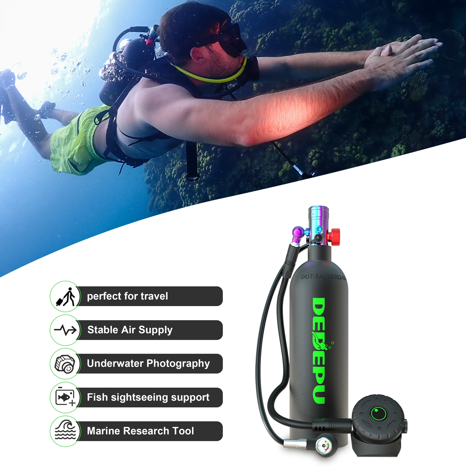 Experience convenient and safe diving with this portable diving system, featuring a 2.3L aluminum diving tank, electric compressor, and backpack for easy transport. Perfect for recreational divers, it provides a reliable supply of breathable air in a compact and high-quality setup. The lightweight backpack design ensures comfort and portability, while the electric compressor allows quick refilling of the tank for continuous underwater exploration. Ideal for snorkeling, scuba training, or short dives, this system combines safety, convenience, and performance in one versatile diving kit.